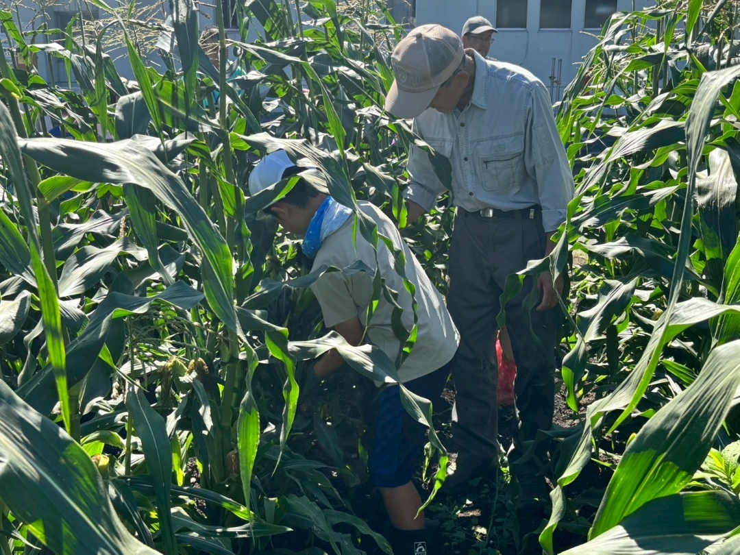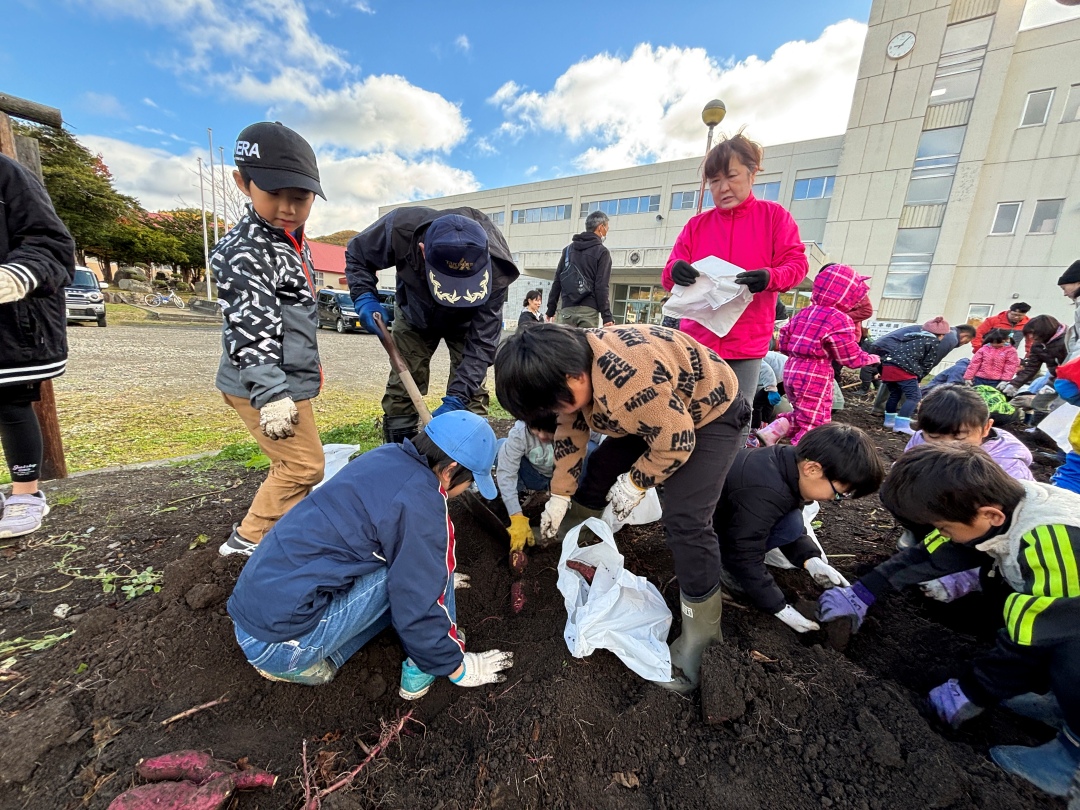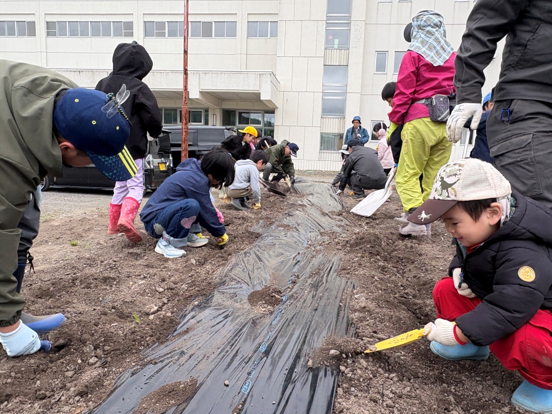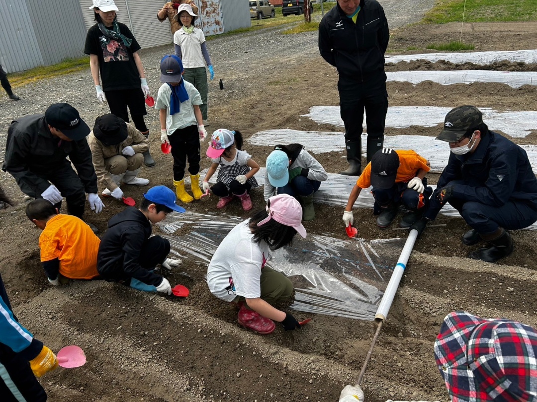 令和6年度には、滝上小学校の前庭の一部が菜園として整備されるとともに、かつて芝桜の苗を育てていた町有地も耕起され、町民を対象とした食育・農業教育の場としての活用が始まりました。地元農家の皆さんの指導のもと、町民と子どもたちが一緒になって、サツマイモや落花生、オクラ、スイートコーンなどを播種・収穫する体験活動が行われました。