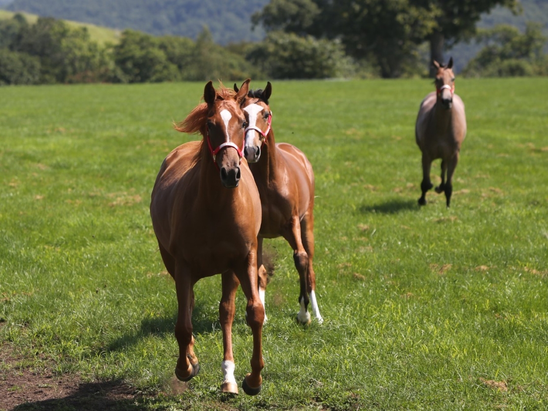 北海道静内農業高等学校の放牧地を駆ける馬たち