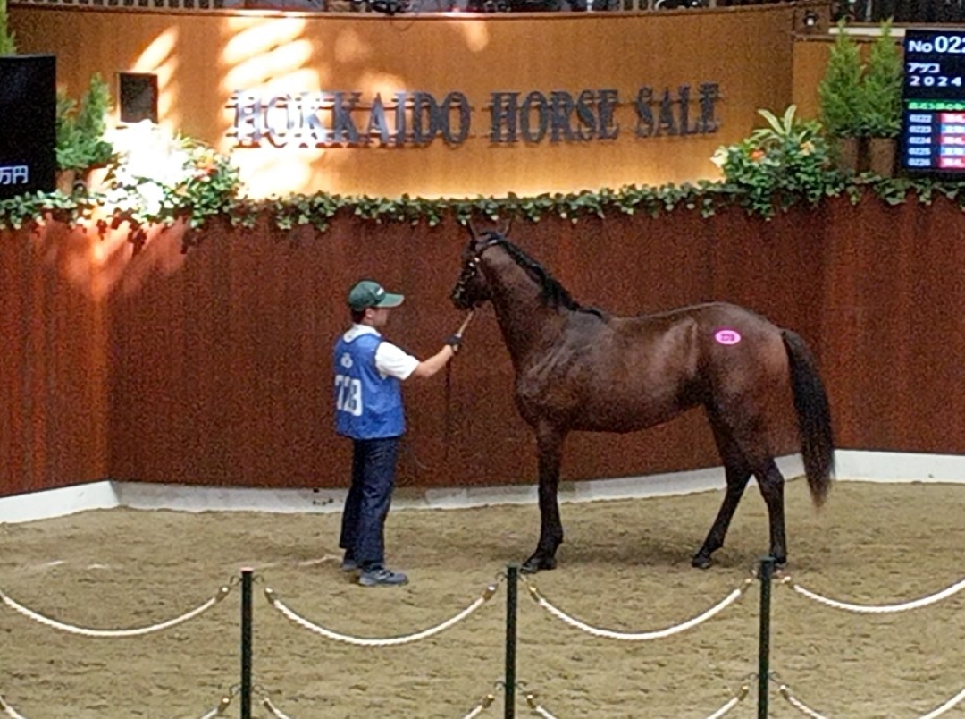 教育活動として、競り場で馬を誘導する(令和7年セプテンバーセール会場:日高軽種馬農業協同組合)