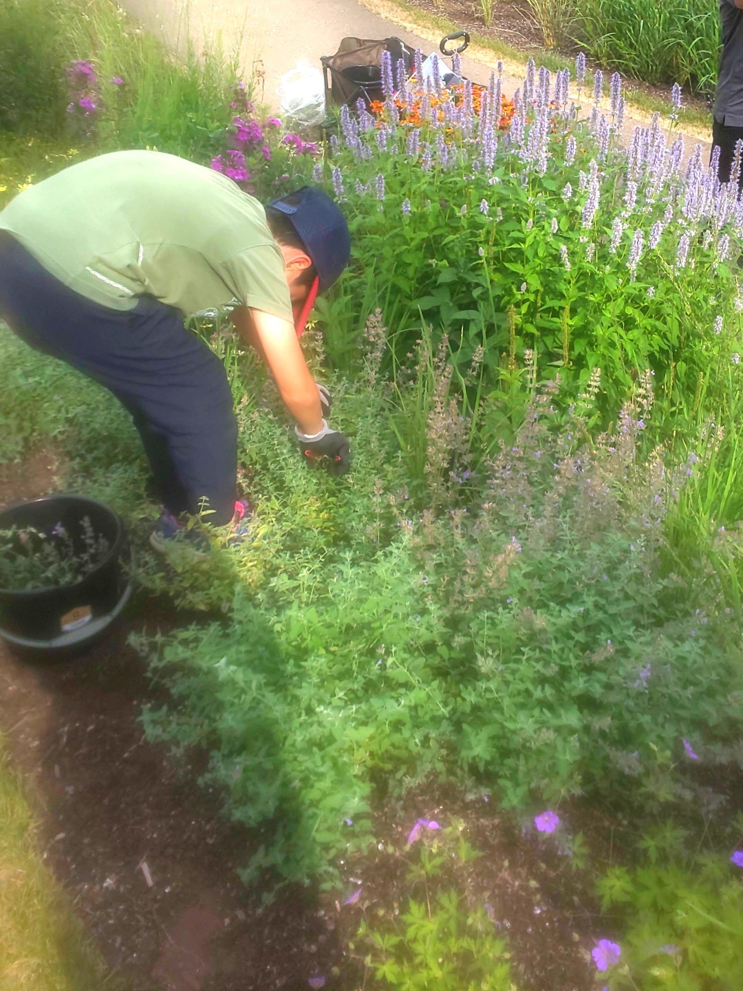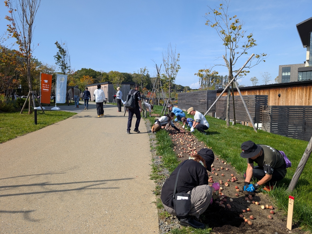 昨年は、3つのガーデン内での活動だけではなくFビレッジ内の道沿いにひまわりを植える作業も。夏の青空の下、ひまわりはきれいに咲き、訪れる人々の目を楽しませていたが、それだけではない。咲き終わったひまわりは緑肥として土にすき込むのだ。ひまわりは景観美化としてはもちろんのこと、緑肥としても大活躍。ひまわりをすき込んだ土には、冬を迎える前に、湧別町から寄贈されたチューリップの球根を植えていた。