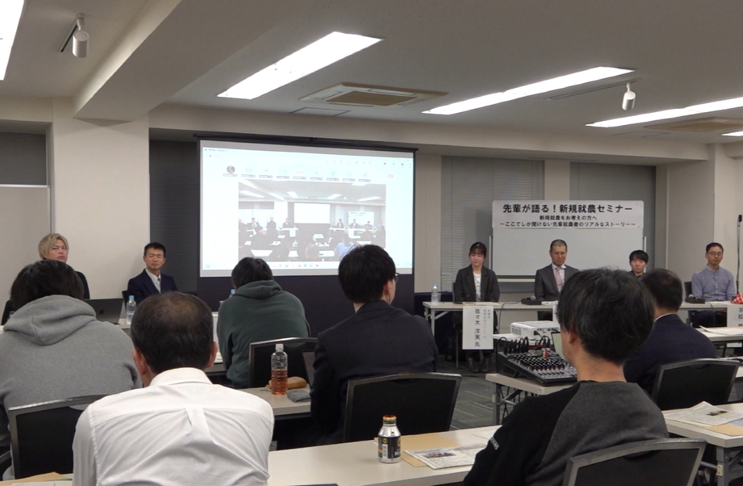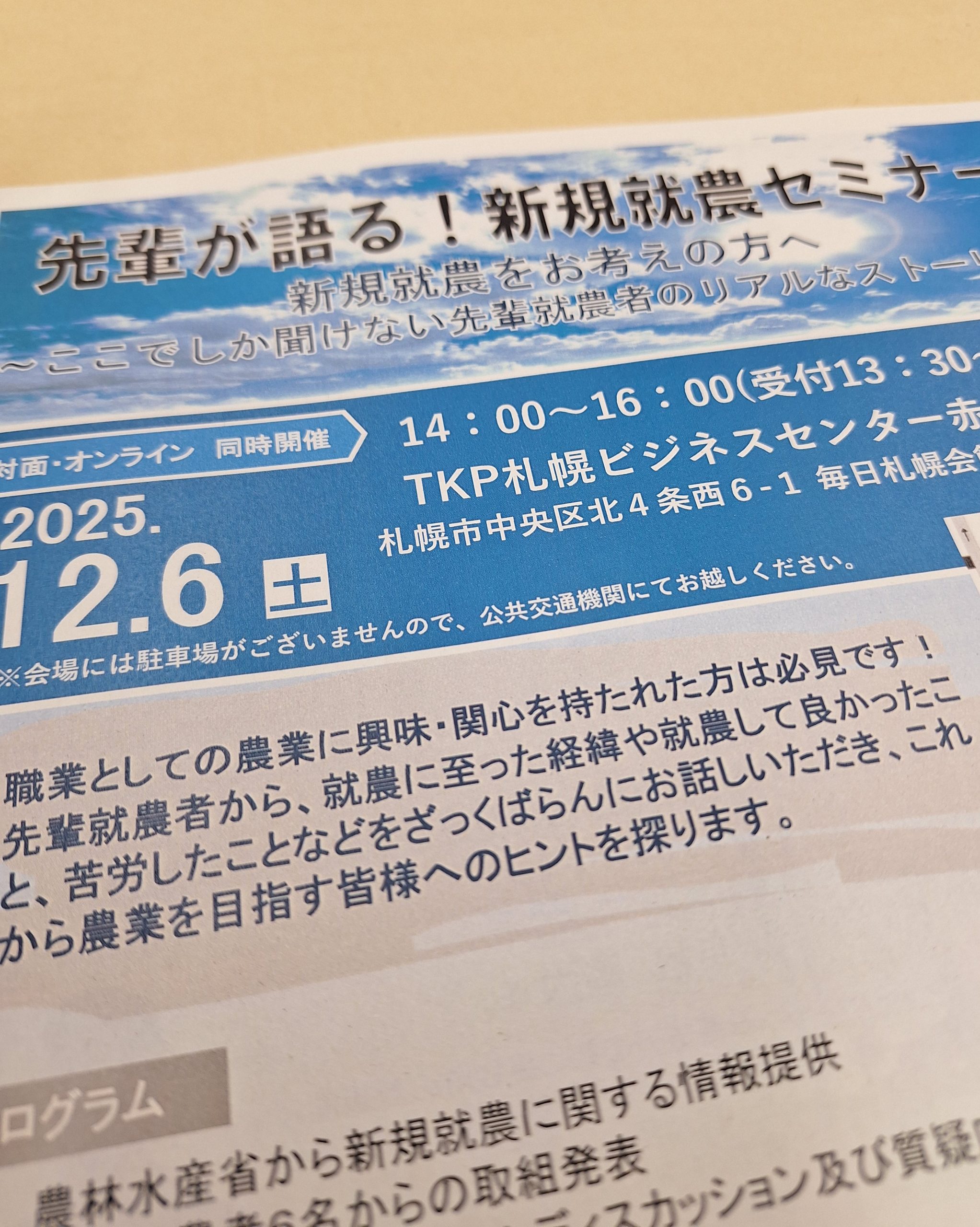 2025年12月6日(土) TKP札幌ビジネスセンター赤れんが前にて、「先輩が語る!新規就農セミナー」が開催された。会場には21名の新規就農を目指す方々が集まり、オンラインでも49名の参加があった。農林水産省経営局就農・女性課の加藤経営専門官からオンラインではあったが新規就農に関する情報提供があり、農林水産省の施策の具体的な説明があった。その後、新規就農経験者である6名の発表者から就農に至った経緯や就農してよかったことや苦労したことなどの話があった。