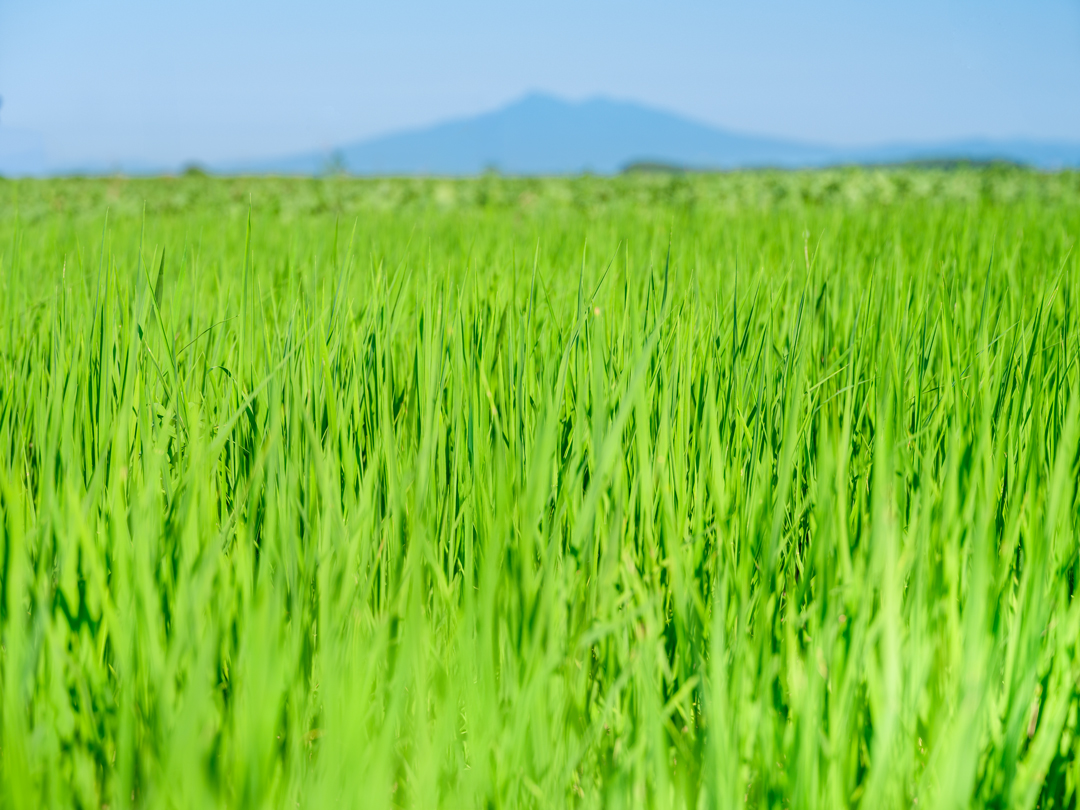 福田米を作っている畑。背後に見えるのは知床山脈。網走の年間平均気温は6.9度とかなり低く、米作りには