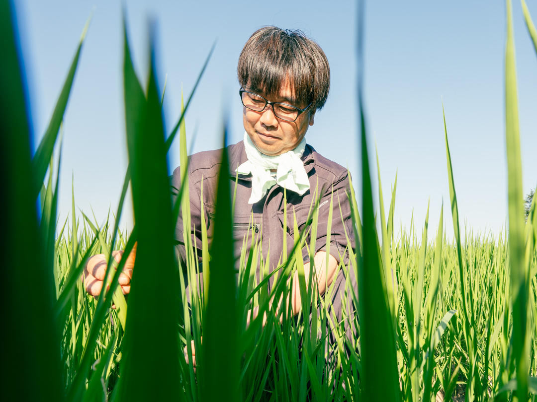 稲の成長を細かくチェックする福田さん。畑の雑草もきちんと抜かれていて、丁寧に育てられているのが