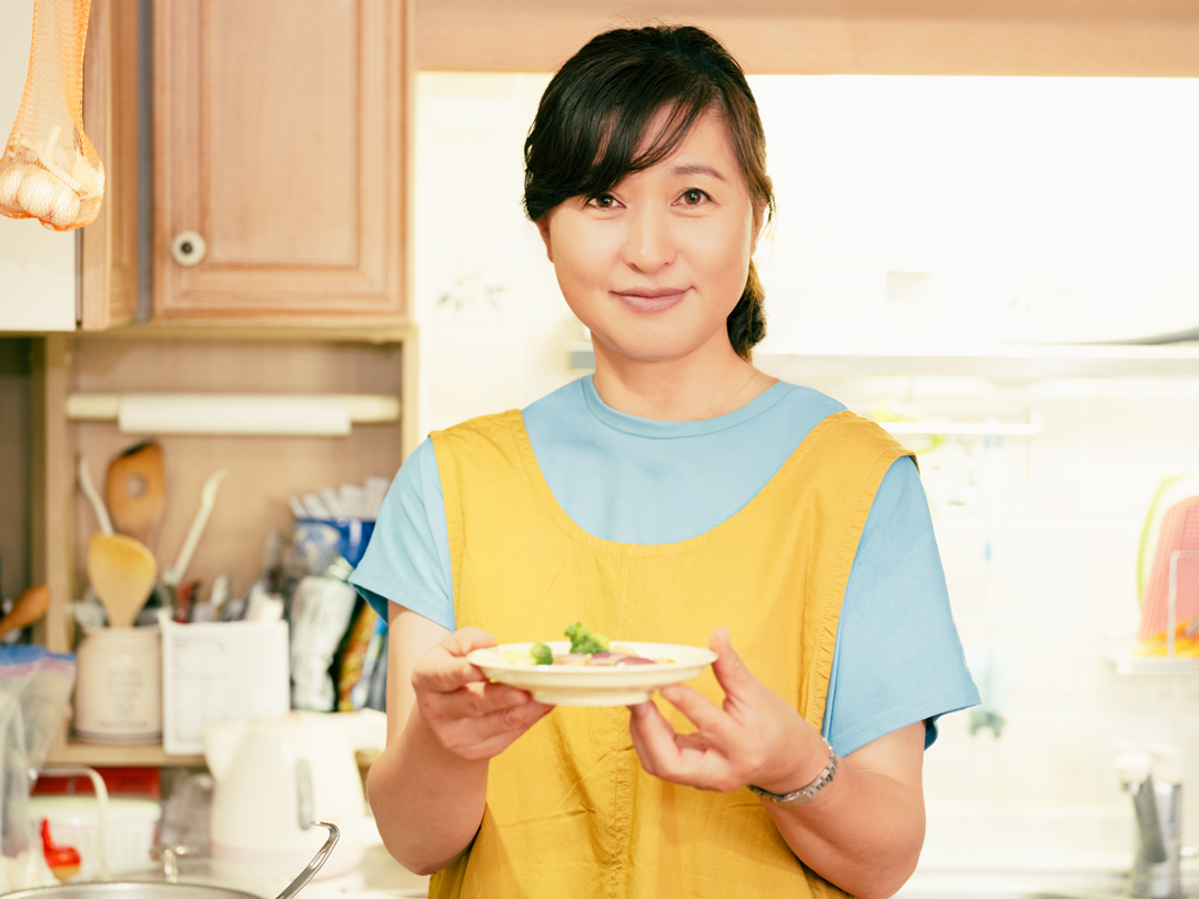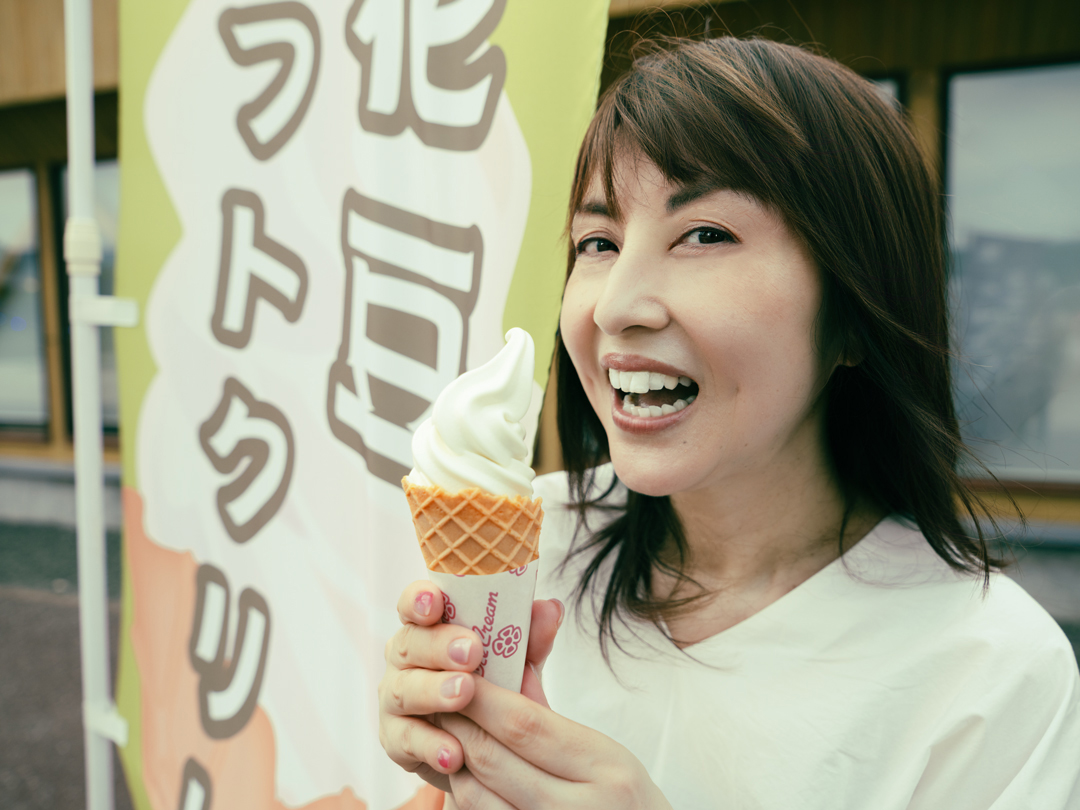 HAL財団アンバサダーのフリーアナウンサー渡辺陽子さんが口にしているのは、道の駅おんねゆ温泉が、るべしべ白花豆くらぶと共同開発した〈白花豆ソフトクリーム〉。「豆の風味が感じられ甘さは控えめで食べやすい」と渡辺さん