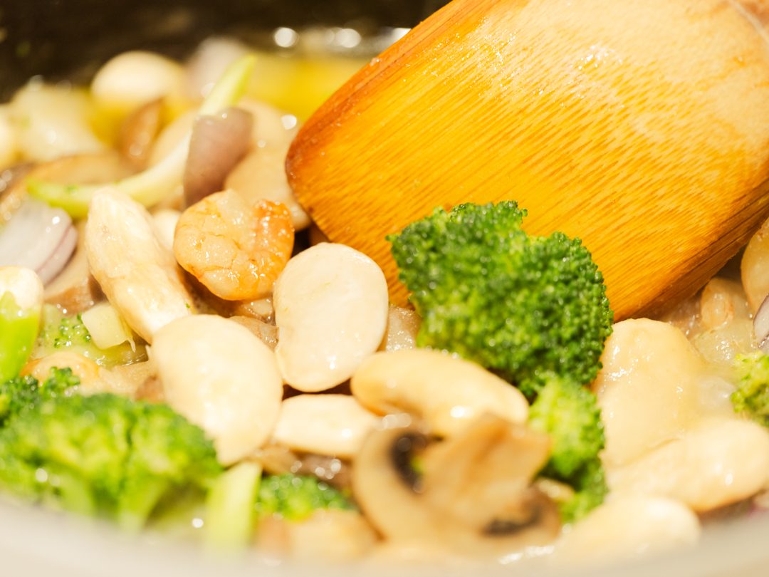 白花豆はサラダのトッピングやマリネ、ポタージュなど色々な料理に使えます。森谷ファームでは、手軽に白花豆を食べることができる、茹でた白花豆のドライパック〈しろはなまめ ドライパック(60グラム×4袋)〉も販売しています。森谷さんが白花豆を使ったアヒージョを作ってくれました。ニンニクの効いたオリーブオイルと白花豆のホクホクした食感と甘さの組み合わせが絶妙です。白花豆は形が崩れないのもいいですね。また白花豆は栄養価がとても高く、鉄分はほうれん草の3倍もあるそう。鉄分を効率よく吸収するためには、ビタミンCを多く含む食べ物(今回のアヒージョにも入っているブロッコリーやじゃがいもなど)と一緒に食べると効果的。また植物繊維は大豆の約7倍、ごぼうやさつまいもの倍以上の含有量を誇ります
