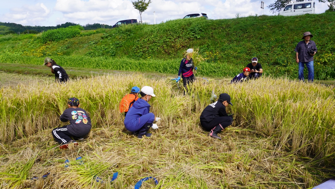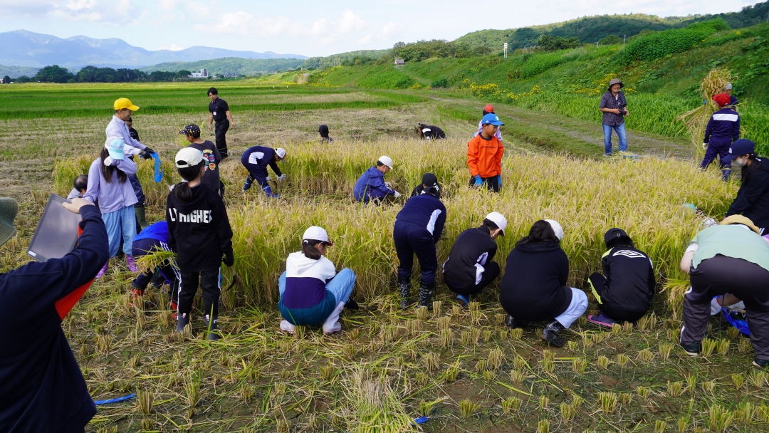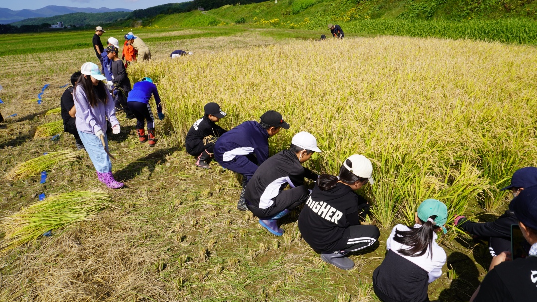9月12日に蘭越小学校5年生による稲刈り授業が行われました。子どもたちは、農業を営む野口さんの指導のもと、鎌を手に取り、丁寧に稲を刈り取りました。汗を流しながら収穫の喜びを味わい、自然の恵みを肌で感じながら、田んぼの風景の中でふるさとの魅力を再発見する時間となりました。