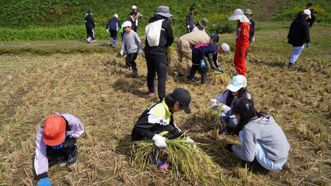活動は春の田植えに始まり、夏の除草や観察、秋の稲刈り・収穫へと続きます。収穫されたお米の一部は学校給食で提供され、みんなで味わうことで学びが日常生活と深く結びつくとともに、町が主催する“米-1グランプリ”にも出品し、地域とのつながりも深めています。