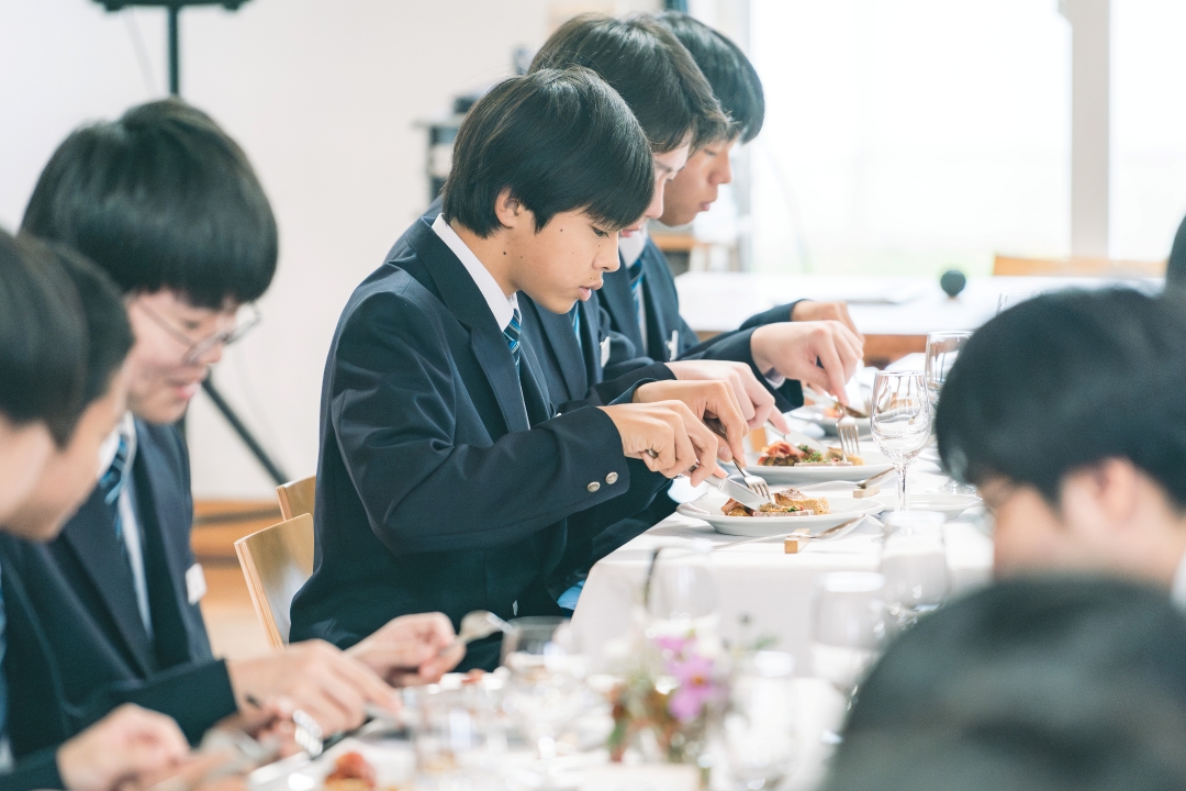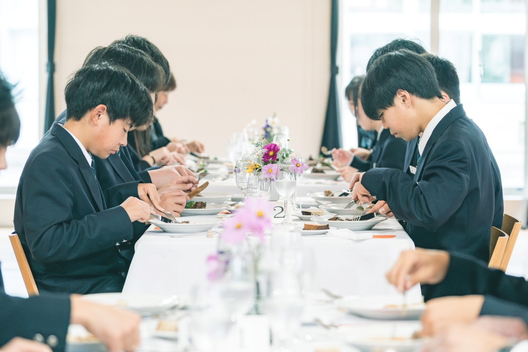 そして、中学生になると、“東川”ならではの食文化を学ぶ「LOCAL’S TABLE(ローカルズテーブル)」の授業が始まります。1年生では町内の生産者から食材について学び、2年生では料理の作り手から素材を活かす工夫や知恵を教わります。3年生になると、料理の完成形やテーブルマナーを学びながら、「思いやりのルール」を通して、言葉にしなくても伝わる「気遣い」の心を育んでいきます。