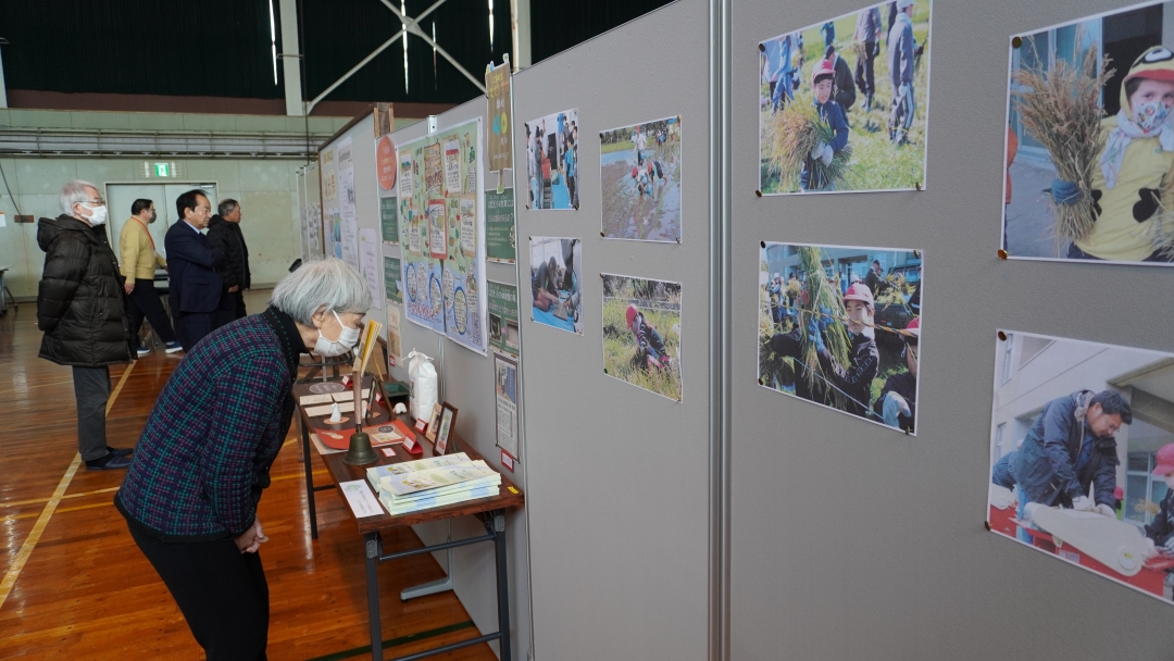 開校40周年と農耕体験学習の掲示を見つめる中村さん
