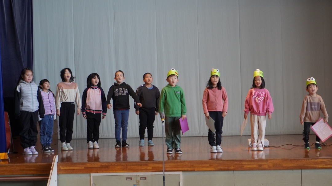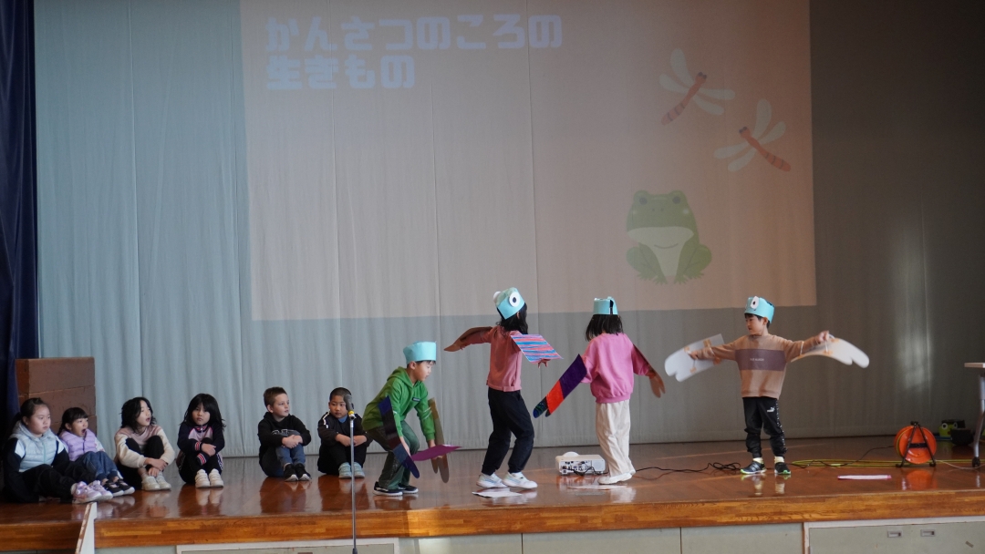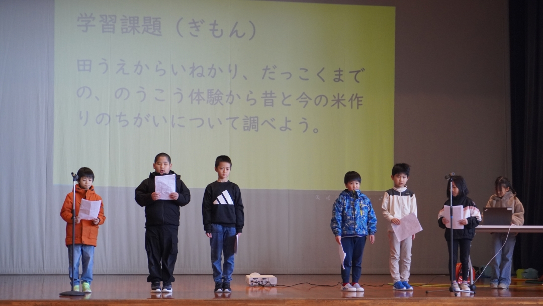 児童たちは、低学年から高学年まで、それぞれの学びや気づきを発表しました。低学年生は、田植えから脱穀まで年間を通じた農作業やとんぼやかえるなど他の生きものの様子、中学年生は今と昔の米作りの比較、高学年生は、稲が育つために必要な条件やこれからの農業について発表し、一人ひとりの言葉には熱がこもっていました。