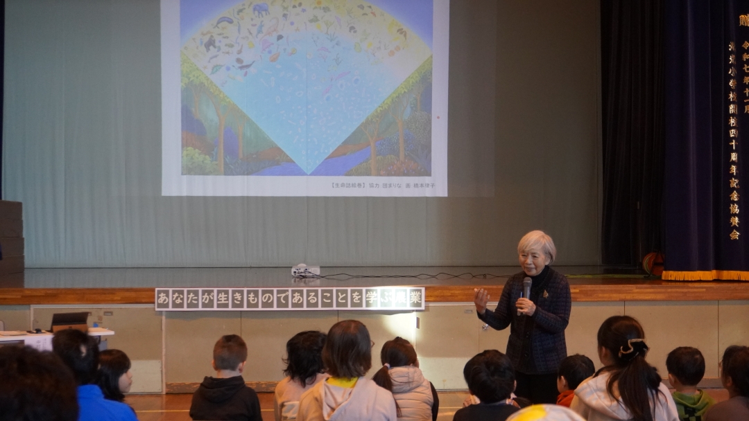 2025年12月12日(金)、JT生命誌研究館名誉館長であり、当財団の『小学校“農業科”教育イニシアティブ』共同代表でもある中村桂子さんが、江別市立北光小学校を訪れ、全校児童23名に向けて、『あなたが生きものであることを学ぶ農業』と題した特別授業を行いました。