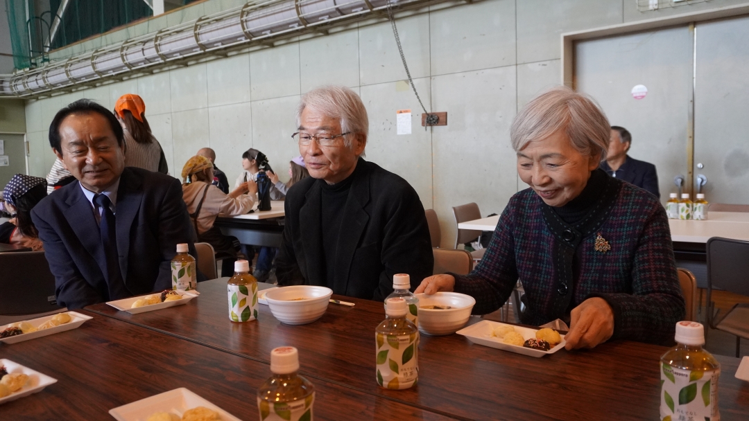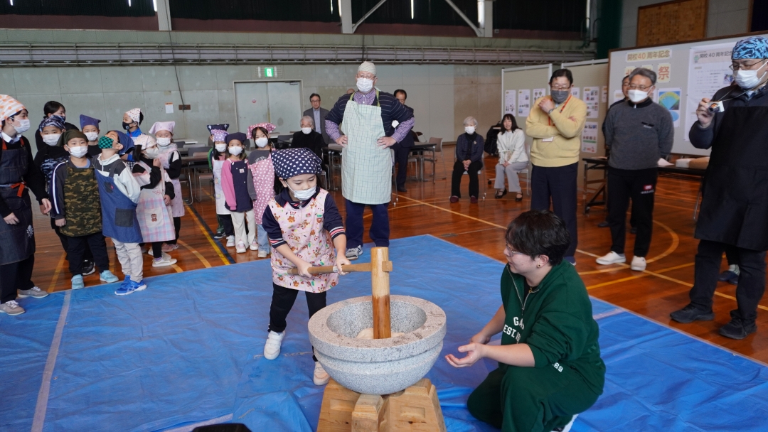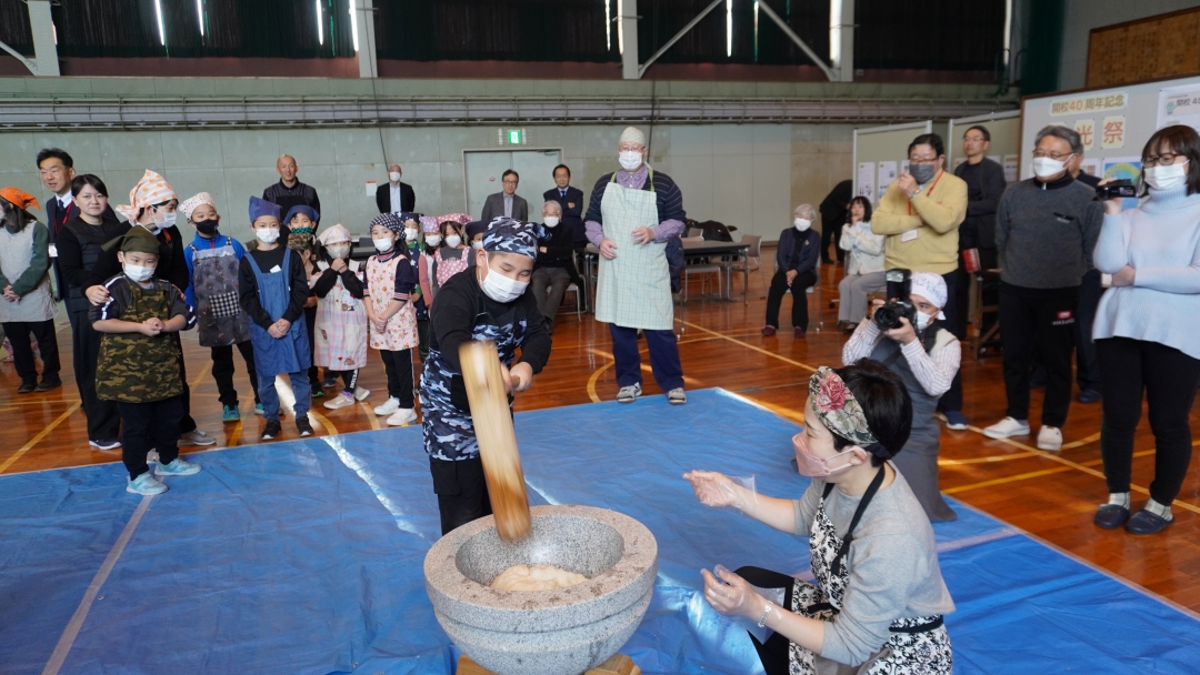 授業後には、収穫したもち米で児童・保護者・地域の皆さん全員が餅つきを行い、きな粉やチーズ、チョコレートをまぶしたお餅やお雑煮をみんなで分かち合いながら、収穫と学校の40周年を祝いました。児童から地域の協力者や中村さんに感謝状が贈られ、 伊藤校長からは「農耕学習は“いのち”の学習」とのお話がありました。さらに中村さんからは「たくさんのふしぎ」と題した“いのち”や“生きもの”をテーマとした絵本2冊が寄贈され、最後に全員で記念撮影をして「北光祭」を締めくくりました。